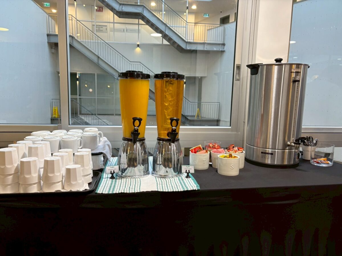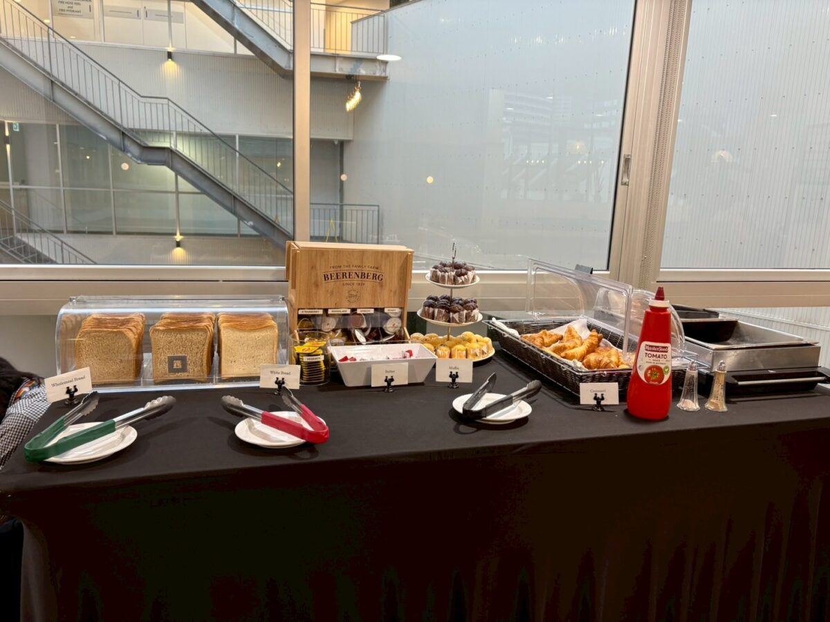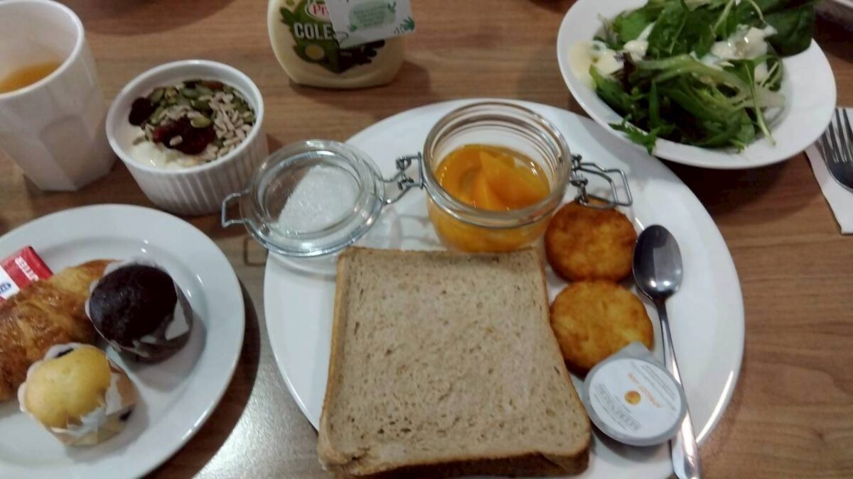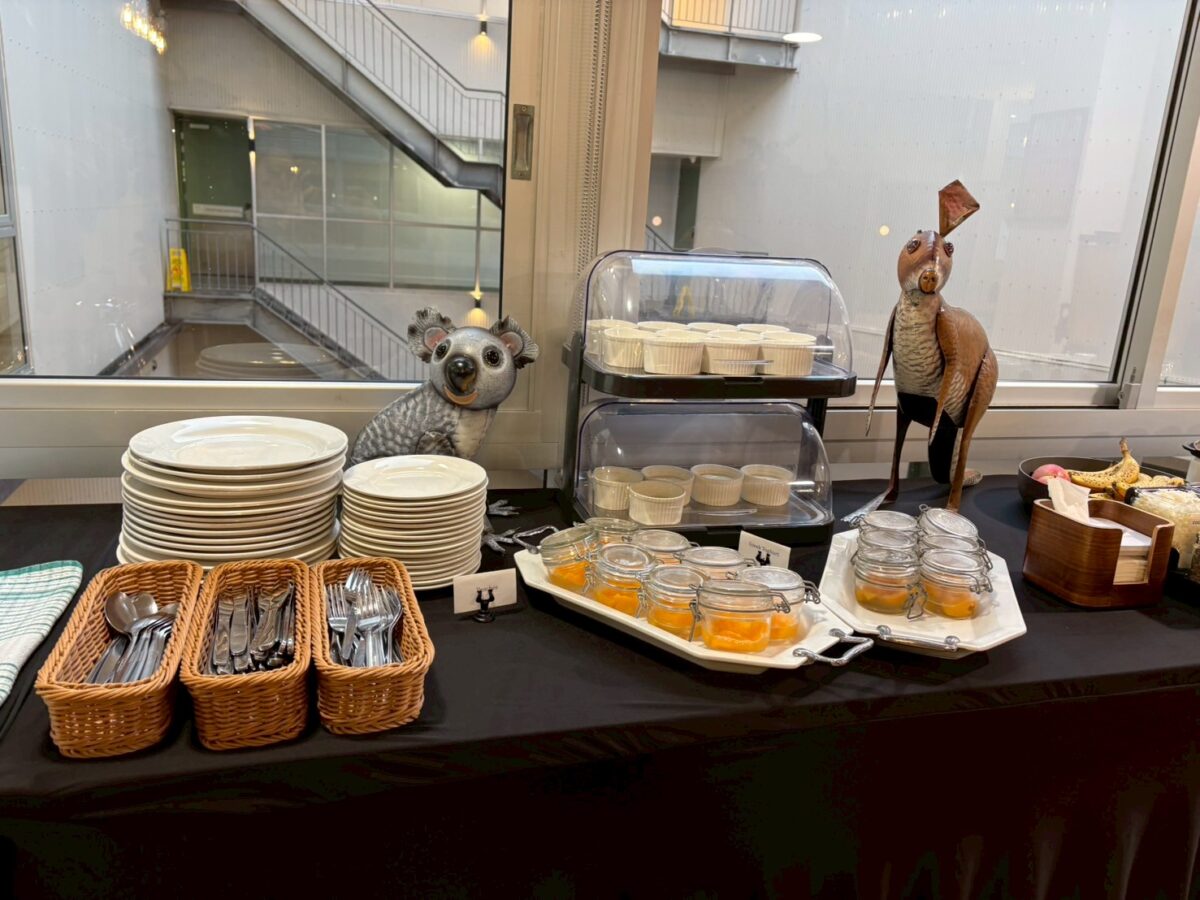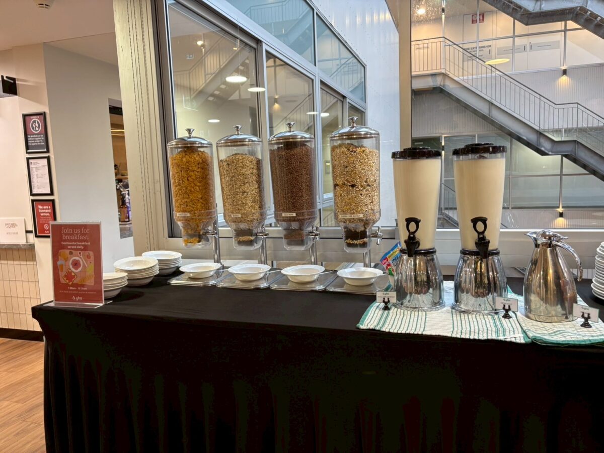 朝食は簡単なビュッフェ形式。フレッシュフルーツやパン、シリアル、ミルク、ナッツ、ヨーグルト、マフィン、フルーツジュース、ハッシュドポテトなど簡単な物ですが、どれもとてもおいしかったです。